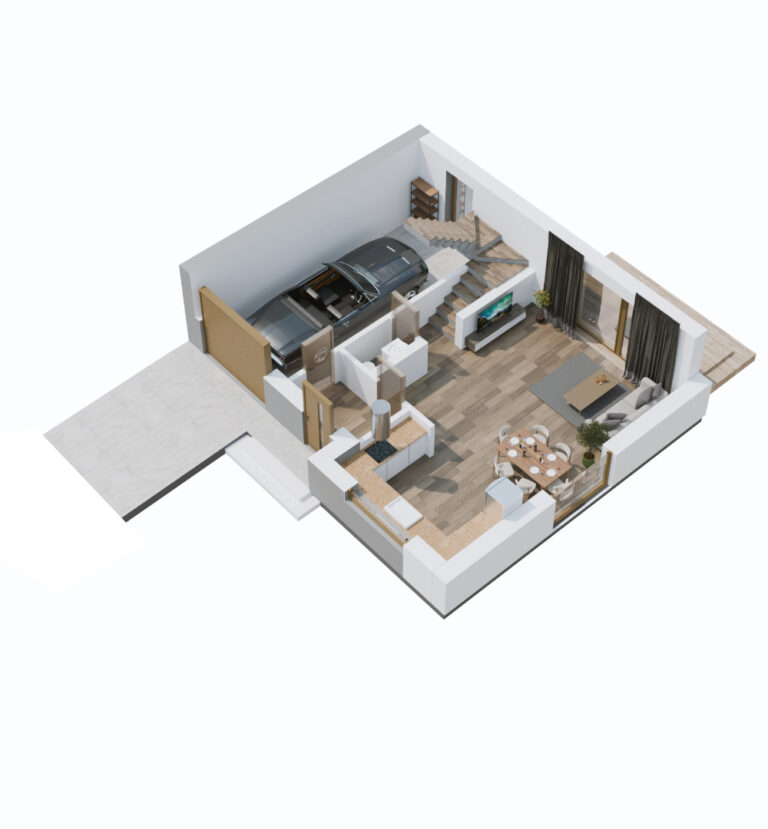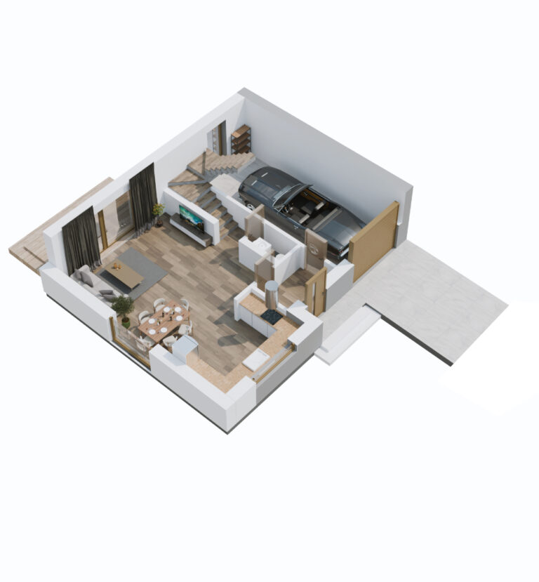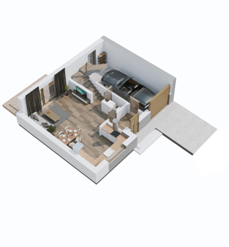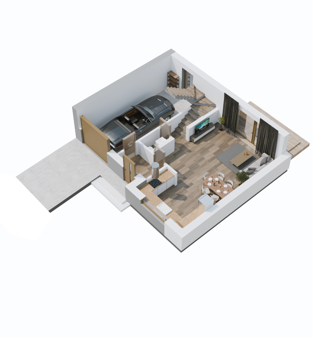 W bryle budynku znajduje się garaż, w którym oprócz samochodu i rowerów zmieszczą się wszystkie niezbędne akcesoria ogrodowe. Garaż ma wejście do strefy domowej oraz bezpośrednio na ogród. Do tego dochodzą praktyczne udogodnienia, takie jak ogrzewanie podłogowe, rekuperacja i szerokie podjazdy, na których również można zaparkować samochód.