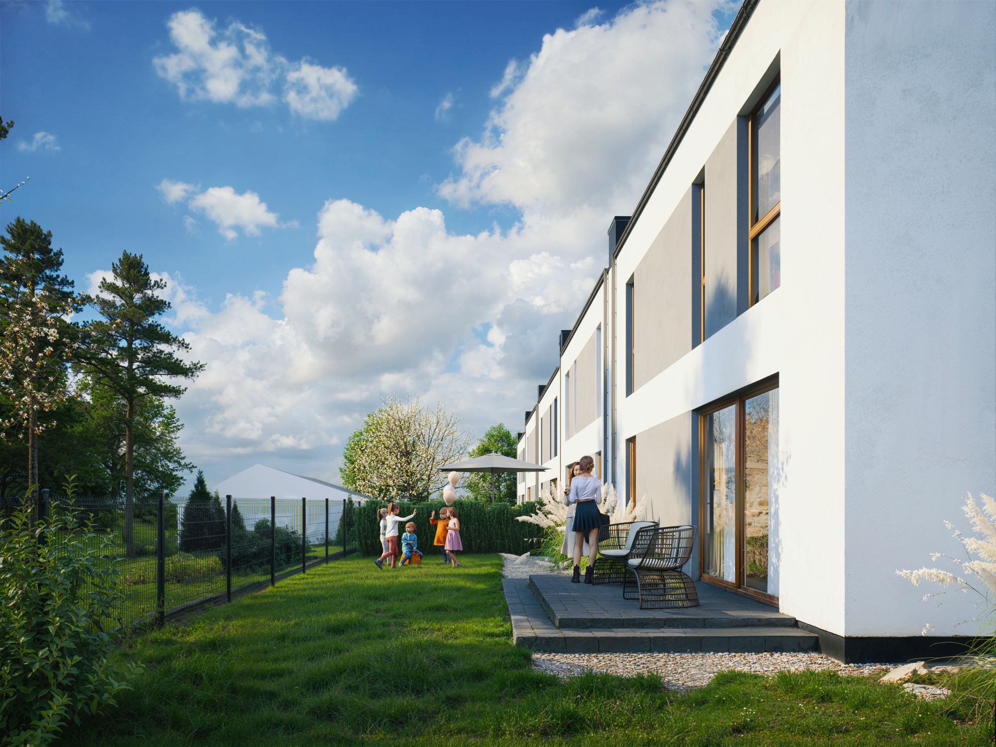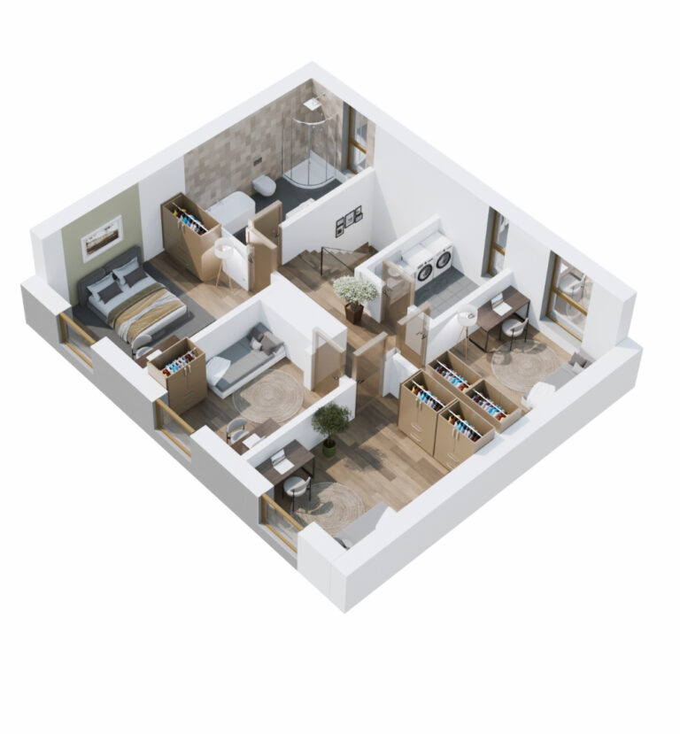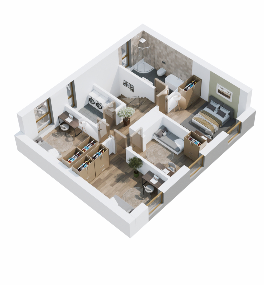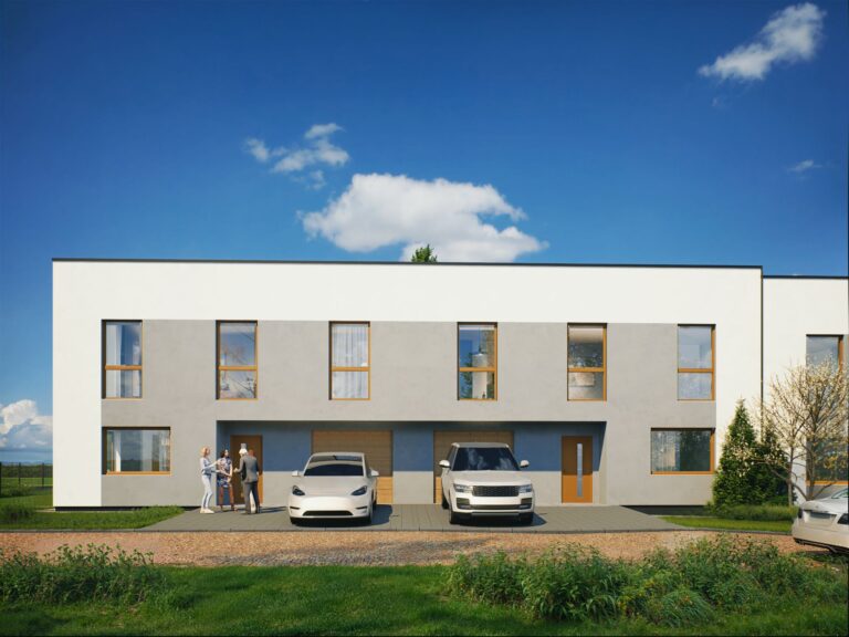 Domy na Tuwima to kameralna inwestycja pięciu segmentów, zaprojektowana tak, żeby dać Ci maksimum komfortu na co dzień. Prosta, nowoczesna architektura, duże przeszklenia i przemyślane układy sprawiają, że od razu czujesz się tu swobodnie. Każdy dom ma 128 m² powierzchni oraz własny ogród. We wnętrzach czeka na Ciebie duży, jasny salon z wyjściem na taras, wygodna kuchnia, toaleta oraz praktyczny wiatrołap, a na piętrze cztery komfortowe pokoje, łazienka i pralnia.